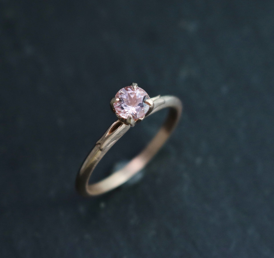 A vintage inspired rose gold ring. This ring features a subtle and sweet 14k rose gold prong setting that gives this ring a vintage feel. The ring includes a .40 ct (5mm) morganite. The band measures 1.5mm wide and 1.5mm thick. The morganite rises a comfortable 6.5mm above the finger. The design makes this ring easy to stack with a wedding band, if you have any questions what will work with this ring please don't hesitate to send me a message!