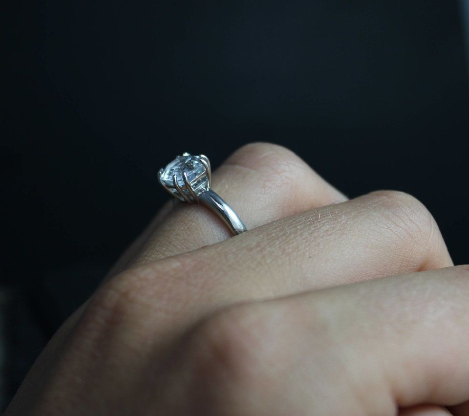 I have prong set this white topaz and the ring rises 6mm above the finger. The last photo on a hand is the yellow gold version.