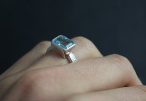 The shank measures 4mm wide and 2mm thick. The blue topaz rises a comfortable, but dramatic 6mm above the finger.