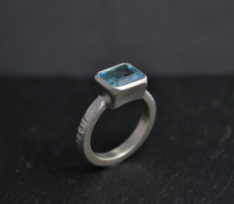 This ring features one 9mm by 7mm bright blue topaz gemstone. I set this gemstone in a sterling silver bezel on top of a textured sterling silver shank. The extra texture on the shank makes this ring even more fun!