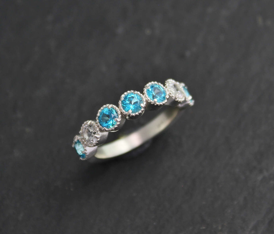 This ring features five 3.5mm paraiba blue topaz and two 3.5mm white topaz. I set these gemstones in textured sterling silver bezels on top of a sterling silver band. The band measures 2.25mm wide and 2mm thick. The gemstones rise a comfortable 3mm above the finger.