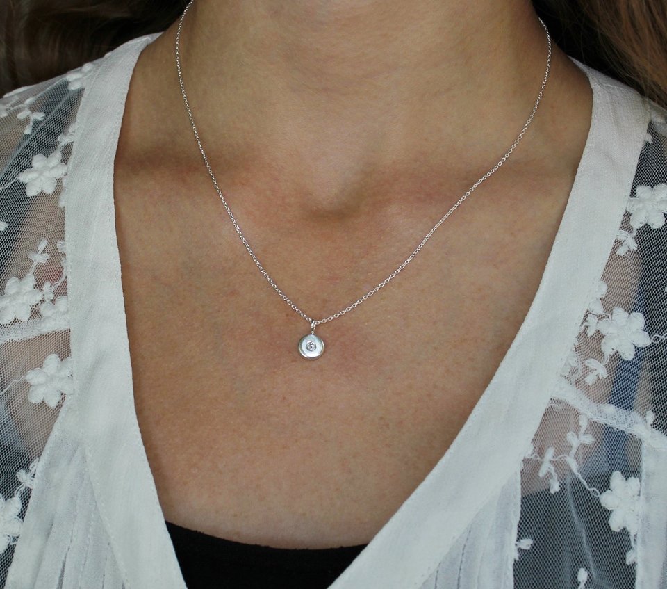 This hand hammered diamond coin contains a round brilliant diamond of a varying weight from .05 to .8 carat diamond of H-I Color and SI clarity. I flush set the diamond in recycled tarnish resistant argentium sterling silver.