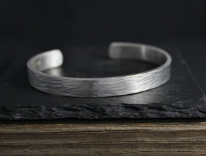 This cuff is approximately 8mm in width. I have hammered the the cuff so the silver has been hardened to retain it's shape. It has a soft rounded form which looks lovely on the arm. It also has a subtle hammered texture.