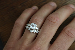 This ring features five 3mm white topaz gemstones. Each white topaz is set in a sterling silver bezel in the sterling silver band. The band measures 2mm wide and 2mm thick. The gemstones rise a comfortable 3mm above the finger. I added a slight bend in the ring so that this can fit next to a variety of rings. This ring makes a perfect wedding band, anniversary ring, or a simple stacking ring.